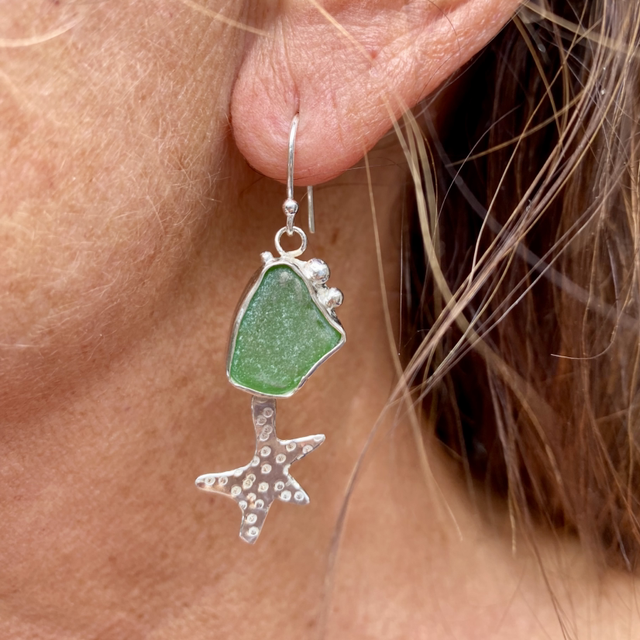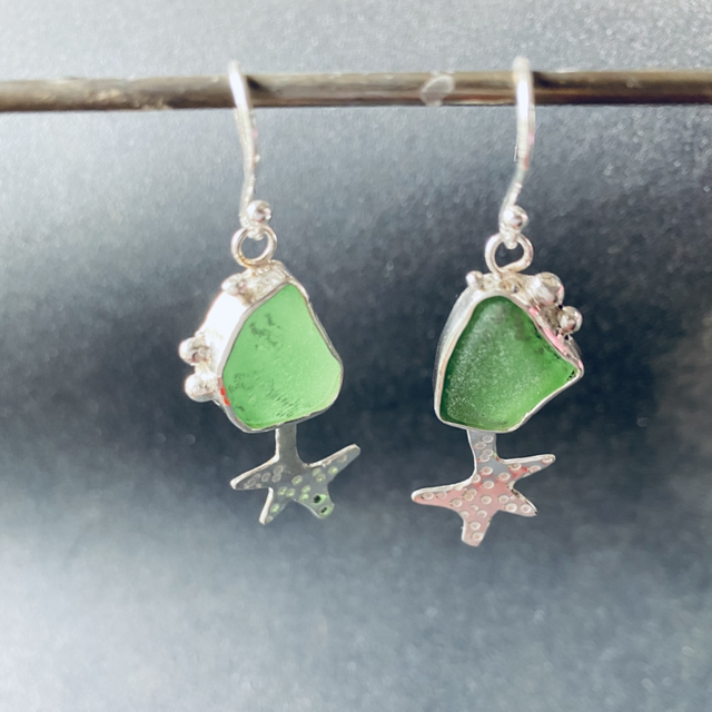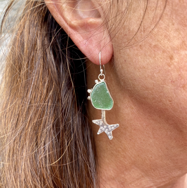 Boucles d’oreilles Etoiles de mer et verres de plages, en argent 925. La nature marine mise en beauté sur vos oreilles et reflète le soleil. Design naturaliste original pour un upcycling des trésors de plages.