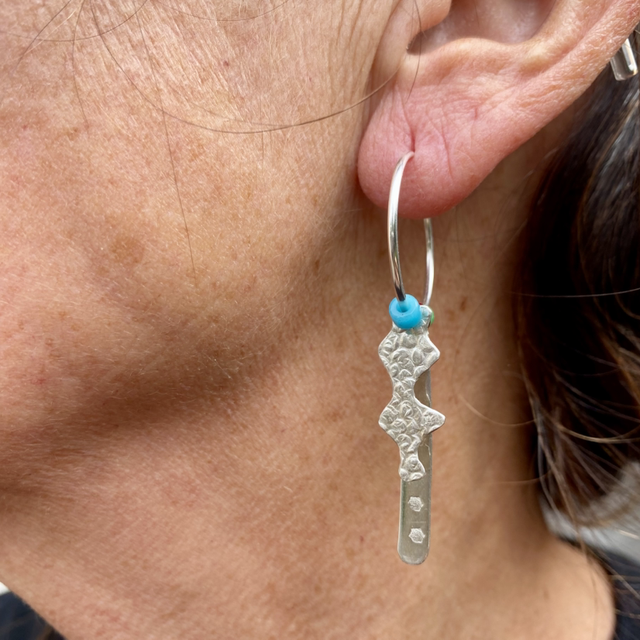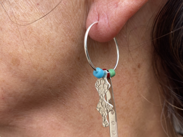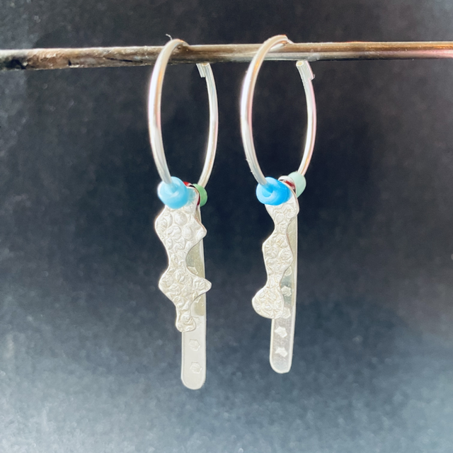 Créoles Algue et tige en argent 925 et perles de verre verte, turquoise et rouge striée. Anneau avec une Algue stylisée et tige texturée en argent de 36 mm. Les boucles d’oreilles tendance et fun qui scintillent à vos oreilles