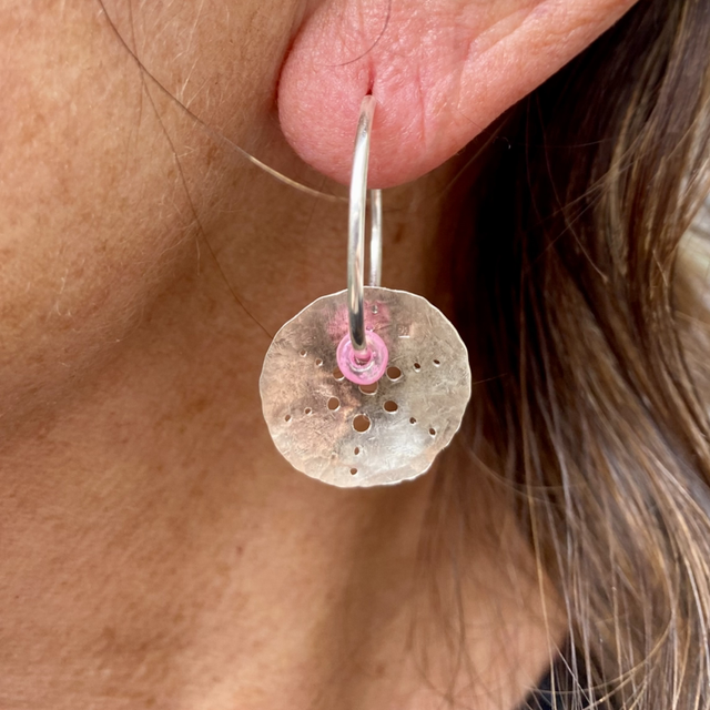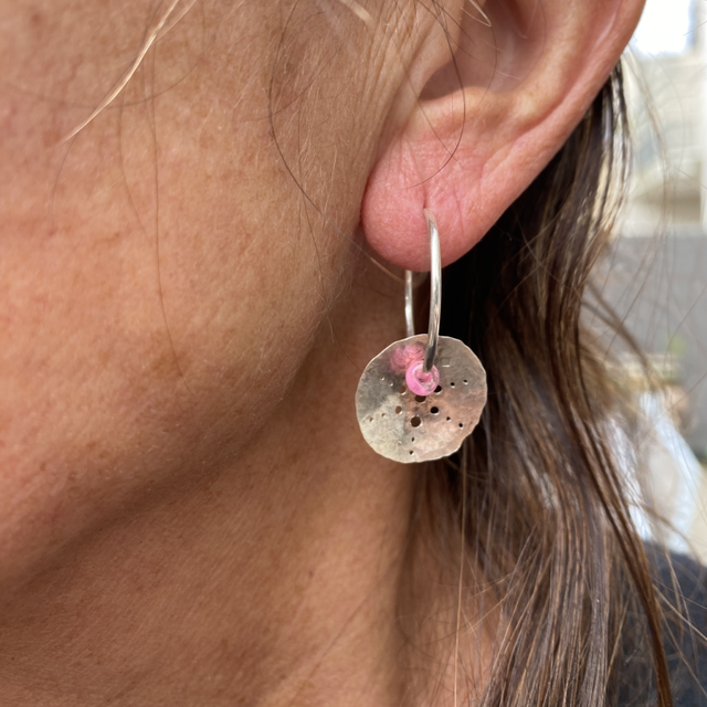 Créoles Oursin en argent 925 et perles de verre rose transparentes. Anneau d’oreilles avec un Oursin stylisé en argent martelé et satiné de 18mm. Les boucles d’oreilles tendance et graphiques à offrir ou s’offrir.