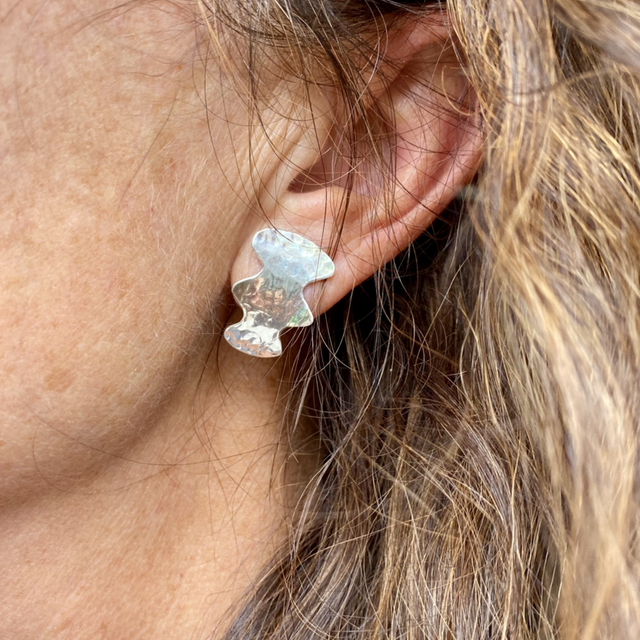 Paire de boucles d’oreille Ondes en argent m rtelé. Design contemporain organique inspiré des reflets dans l’eau